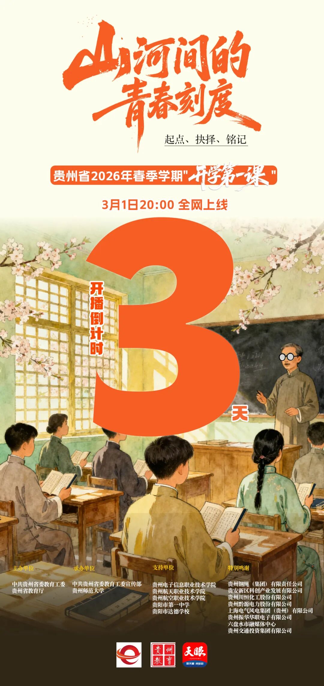 由中共贵州省委教育工委、贵州省教育厅精心策划的贵州省2026年春季学期“开学第一课”——《山河间的青春刻度》,将于3月1日...