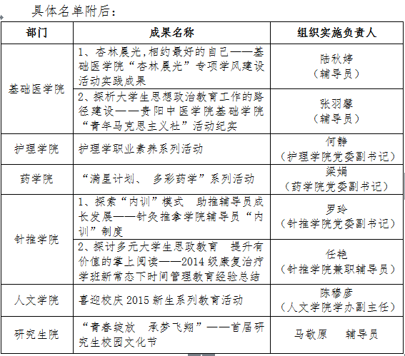 学校新闻备份 上一篇:我校召开2015年学生工作总结表彰大会 下一篇:贵州省“首届研究生英语风采大赛” 我校李艳高增杰... 我校开展2015年大学生思政工作“优秀实践成果申报及评选”活动 2016.01.04 16:51:16 学生工作处(部) 学生工作处(部) 我校2015年大学生思政工作“优秀实践成果申报及评选”活动日前揭晓。此项活动2015年10月中旬正式启动,经过最终评审,共评选出8项2015年学生工作“优秀实践成果”。 据悉,此项活动将为促进各二级学院对不同形式且效果显著的学生工作实践成果进行有效总结,活动将切实推进和创新大学生思想政治教育工作。