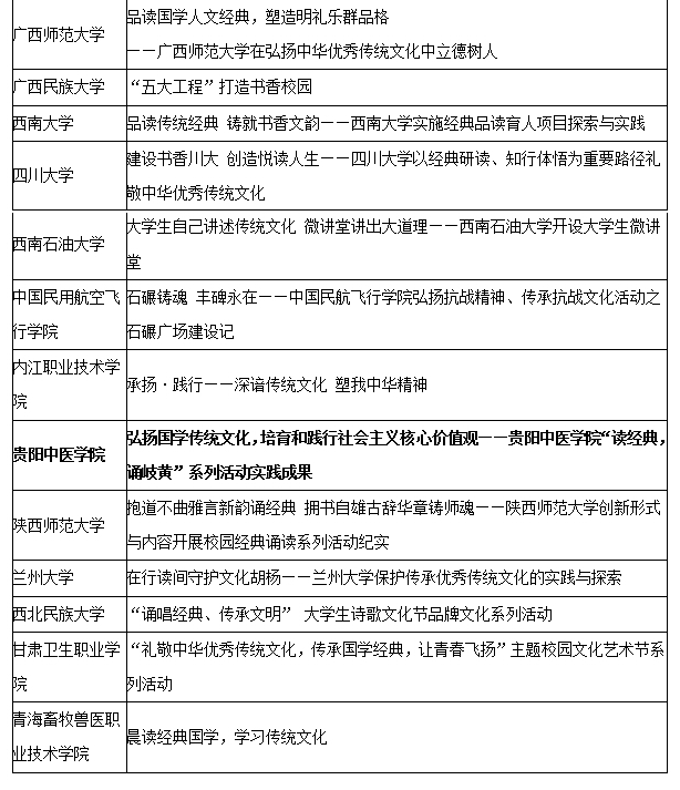 本网讯 日前,第二届全国高校“礼敬中华优秀传统文化”特色展示项目30项评选结果出炉。由我校选送的《弘扬国学传统文化,培育和践行社会主义核心价值观——贵阳中医学院“读经典,诵岐黄”系列活动实践成果》,荣获第二届全国高校 “礼敬中华优秀传统文化”系列活动全国特色展示项目。此名单是根据《教育部办公厅关于开展第二届“礼敬中华优秀传统文化”系列活动的通知》(教思政厅函〔2015〕11号)要求,经高校自主申报、专家推荐的结果,目前正在网上公示。该项目是我省高校此次活动唯一获奖(公示)项目,也是全国中医药类高校唯一获奖(公示)项目。