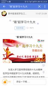 同时,为了在学生中达到广泛的宣传作用,学生工作“易班”平台开设了学习十九大专栏,学生除了可以通过此专栏了解学校及各二级学院开展的相关学习活动外,还可以参加“易”起学习十九大答题活动,并赢取奖品。据统计,目前已有近7000余学生浏览并参与了该活动。