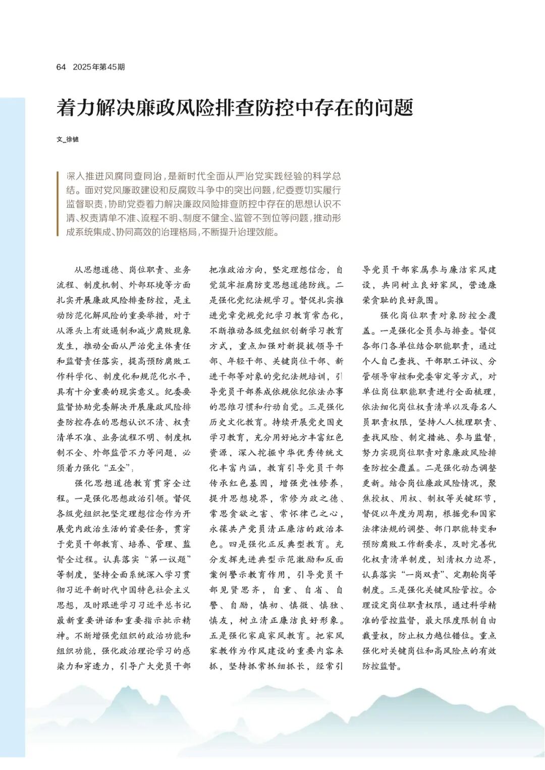 文章讲到,深入推进风腐同查同治,是新时代全面从严治党实践经验的科学总结。面对党风廉政建设和反腐败斗争中的突出问题,纪委要切实履行监督职责,协助党委着力解决廉政风险排查防控中存在的思想认识不清、权责清单不准、流程不明、制度不健全、监管不到位等问题,着力强化“五全”,推动形成系统集成、协同高效的治理格局,不断提升治理效能。全文如下: