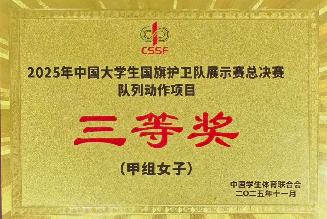 近日,由中宣部宣传教育局、教育部思想政治工作司指导,中国学生体育联合会主办,以“向国旗敬礼”为主题的2025年中国大学生国旗护卫队展示赛总决赛在贵州遵义落下帷幕。我校国旗护卫队凭借出色表现,荣获本科女子组队列展示项目三等奖。