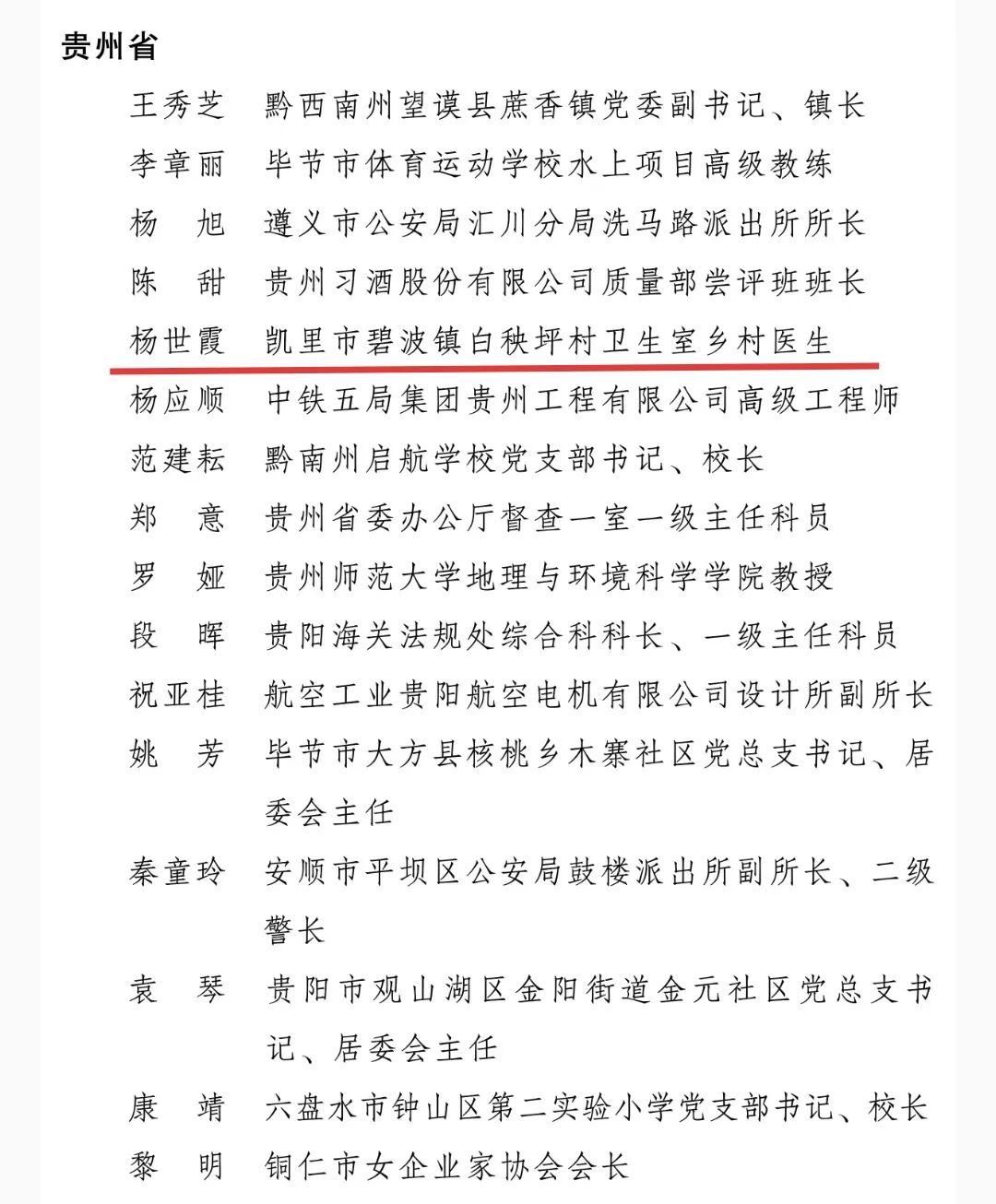 3月2日,全国妇联在京举行纪念“三八”国际妇女节暨表彰大会。大会表彰了9名全国三八红旗手标兵、598名全国三八红旗手、400个全国三八红旗集体、600个全国巾帼文明岗。我校校友、黔东南州凯里市碧波镇白秧坪村卫生室乡村医生杨世霞榜上有名,被授予全国三八红旗手称号。