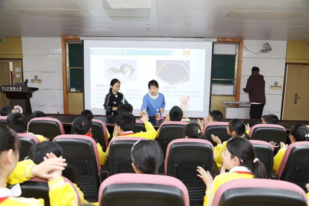 “黔地无闲草——地稔科普”“药食同源中药科普”及“常用中药饮片鉴别科普”板块合并开展。由麻秀萍、谢军丽两位老师及志愿者展示地稔植物标本、讲解其研究现状及药用文化,向小学生派发中药饮片,引导大家通过眼观、手摸、鼻闻辨别饮片特征;趣味猜中药互动环节,以小盲盒为奖励,激发同学们的学习热情。